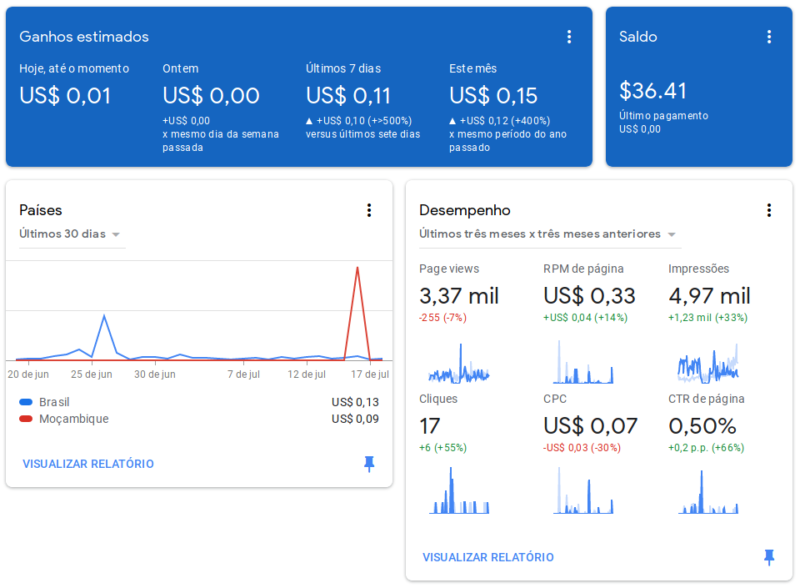 Na prática, como se vê, os ganhos com AdSense não foram exatamente extraordinários. Esse saldo de $36.41 (dólares) é o que acumulei desde junho de 2011, quando comecei a pôr blocos de anúncios, porque o Google só me enviará a remuneração quando ela chegar a cem dólares.