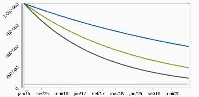 A primeira linha representa uma mortalidade uniforme de 1% ao mês por seis anos (janeiro de 2015 a dezembro de 2020). A segunda linha, mortalidade de 2% ao mês e a terceira, por sua vez, uma de 3% ao mês. Podemos observar neste gráfico que a curva representada pela diminuição demográfica se torna cada vez menos acentuada com o passar do tempo, mesmo que a taxa de mortalidade se mantenha. Trata-se de uma variação do paradoxo de Aquiles e a tartaruga, proposto por Zenão de Cítion: