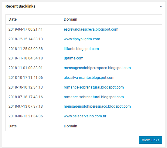 A última vez que alguém chegou a meu blog proveniente de um backlink foi há exatamente três meses e a vez anterior a esta fora há oito meses (desconsidere o “tipsypilgrim”, que está em inglês e porque eu não tenho a mínima ideia de como alguém linkou de lá para mim, e o “uptime”, que é um plugin do WordPress para avaliar a disponibilidade do site).